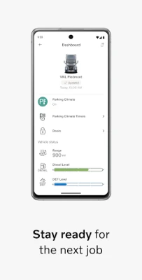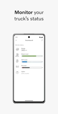 Check the status of fluids, lights, and more, remotely on your device. The dashboard displays fuel, DEF and engine oil levels. Alerts are also displayed when coolant and washer fluid levels are low.